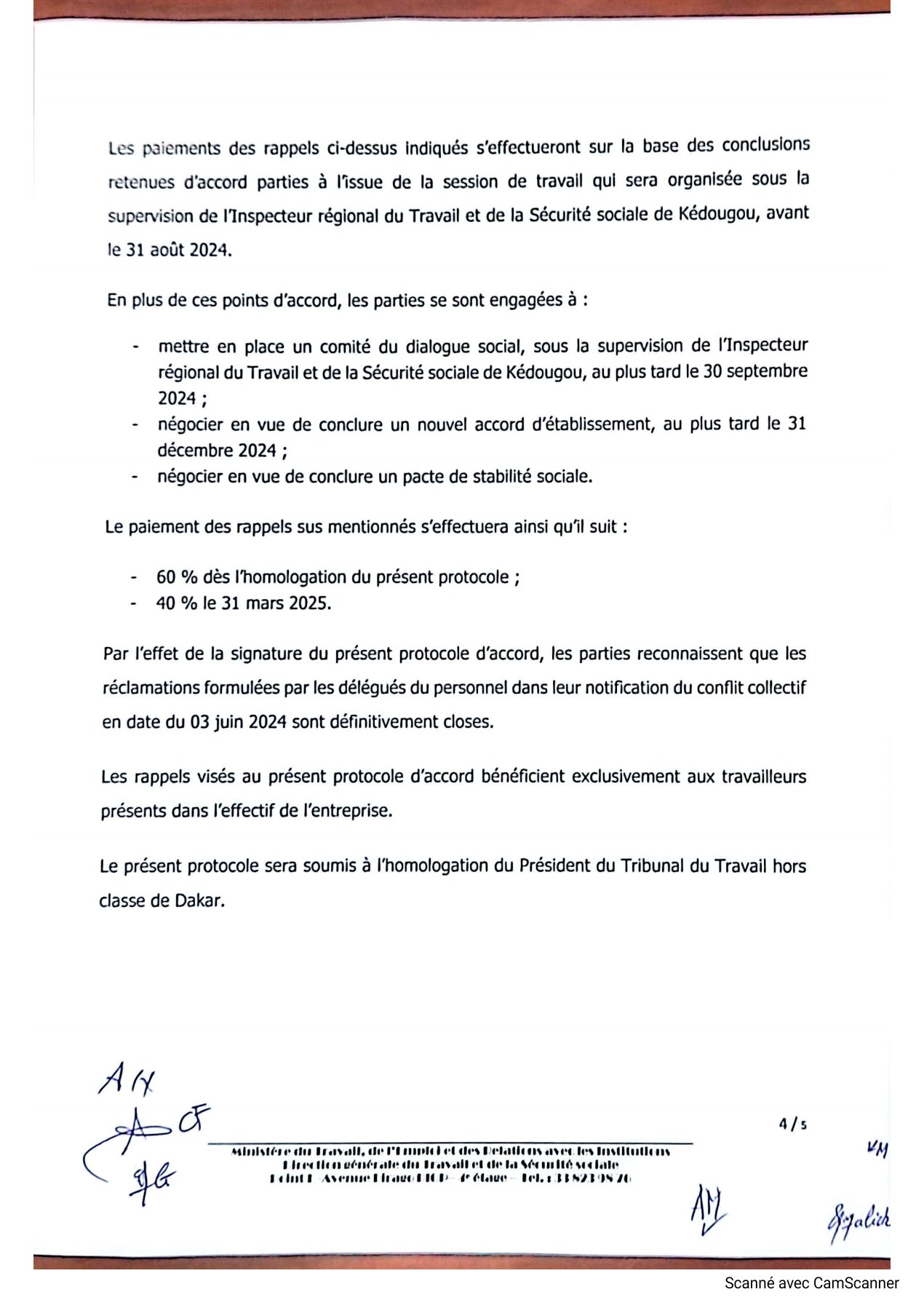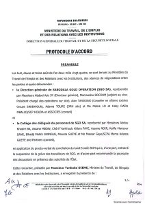 C’est le bout du tunnel qui est franchi aujourd’hui. Cette journée du mardi 13 aout 2024 restera mémorable pour les employés de la mine de Sabodala Gold Opérations car le protocole a été signé entre les deux parties (SGO-EMPLOYES) au ministère du Travail de l’Emploi et les Relations avec les Institutions.