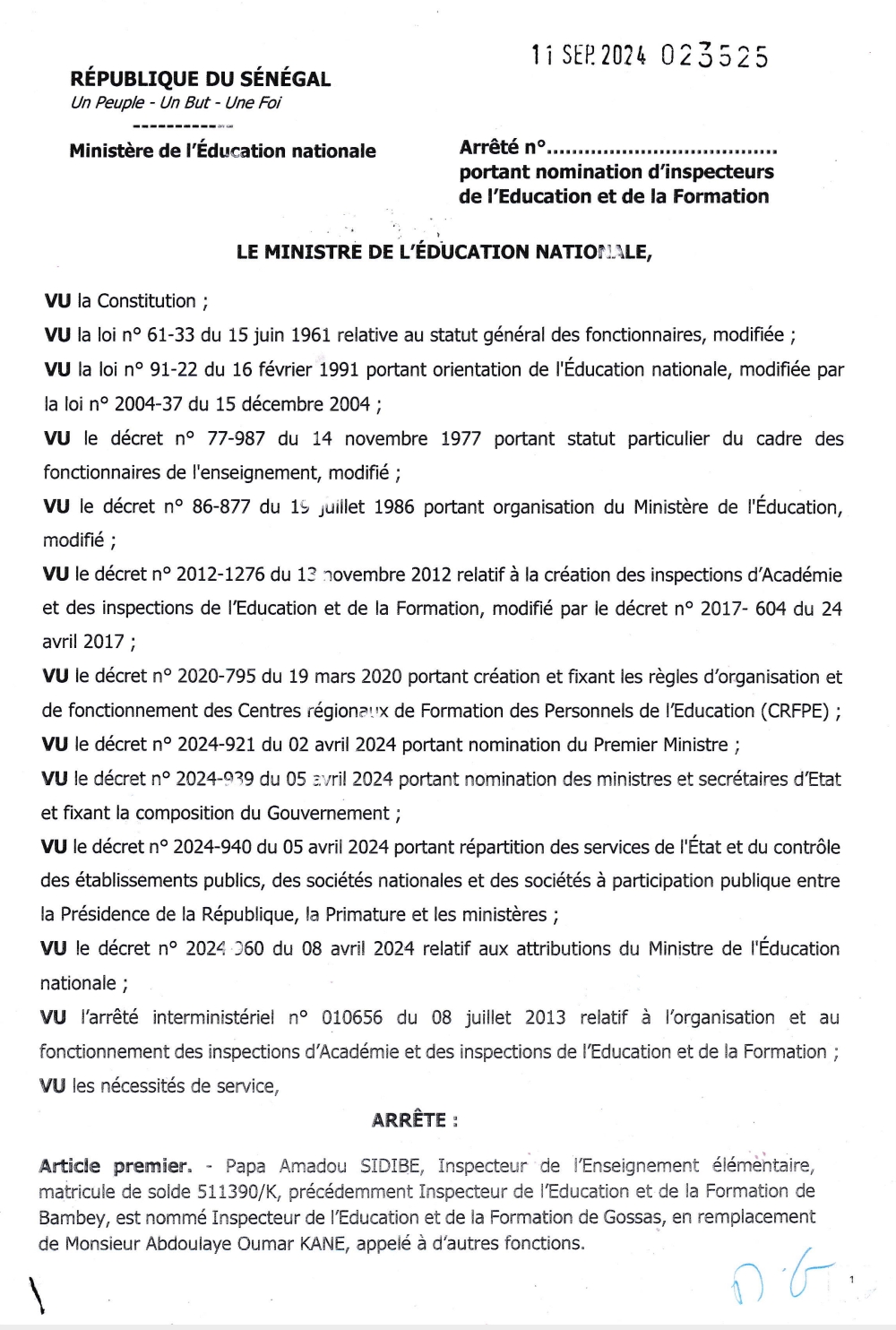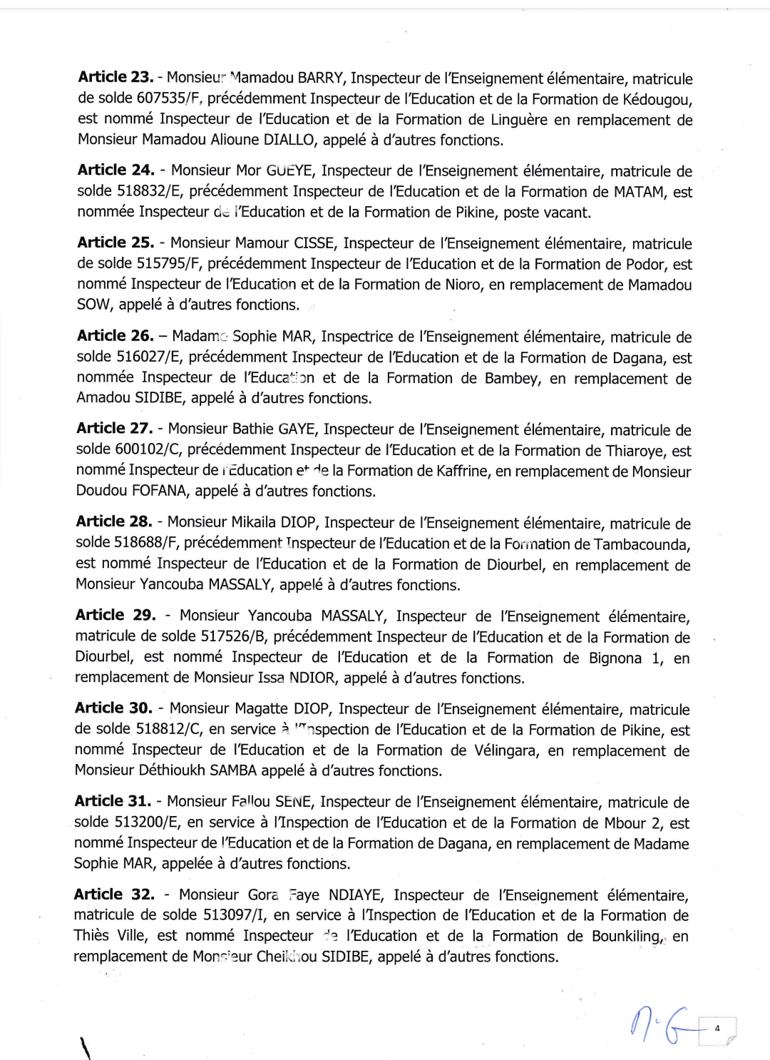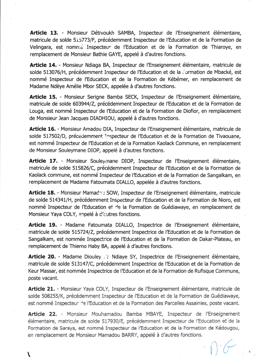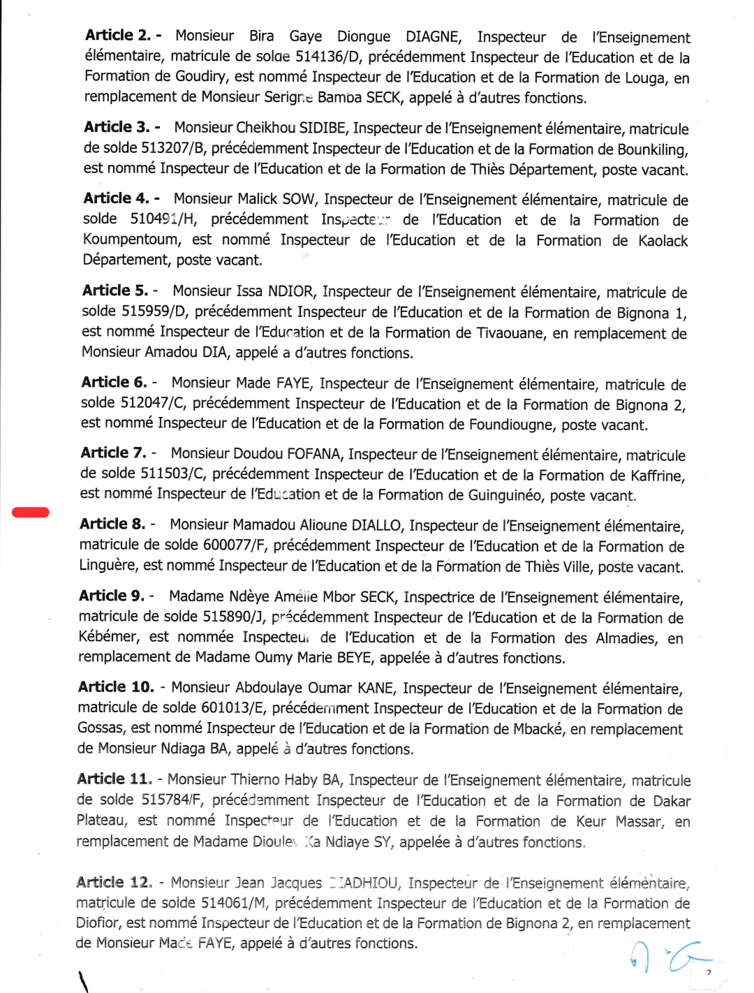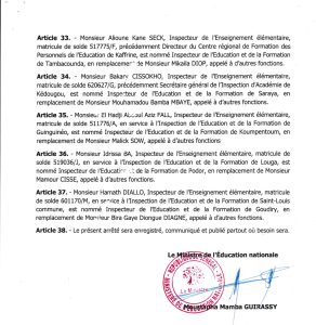 Ce choix judicieux aussi serré a vu la promotion de l’ex secrétaire Général de l’Inspection d’Académie de Kédougou Bakary CISOKHO. Un homme rompu à la tâche, loyal et altruiste comme décrit par l’IA Mamadou Niang ainsi que les autres collaborateurs. Il remplace à ce poste, l’Inspecteur Mouhamadou Bamba MBAYE, appelé à d’autres fonctions, le désormais patron de l’éducation du département de Kédougou. Quant à l’ex Inspecteur de l’Education et de la Formation de Kédougou Mamadou BARRY, Inspecteur de l’Enseignement élémentaire, matricule de solde 6075351F, précédemment Inspecteur de l’Education et de la Formation de Kédougou, est nommé Inspecteur de l’Education et de la Formation de Linguère.