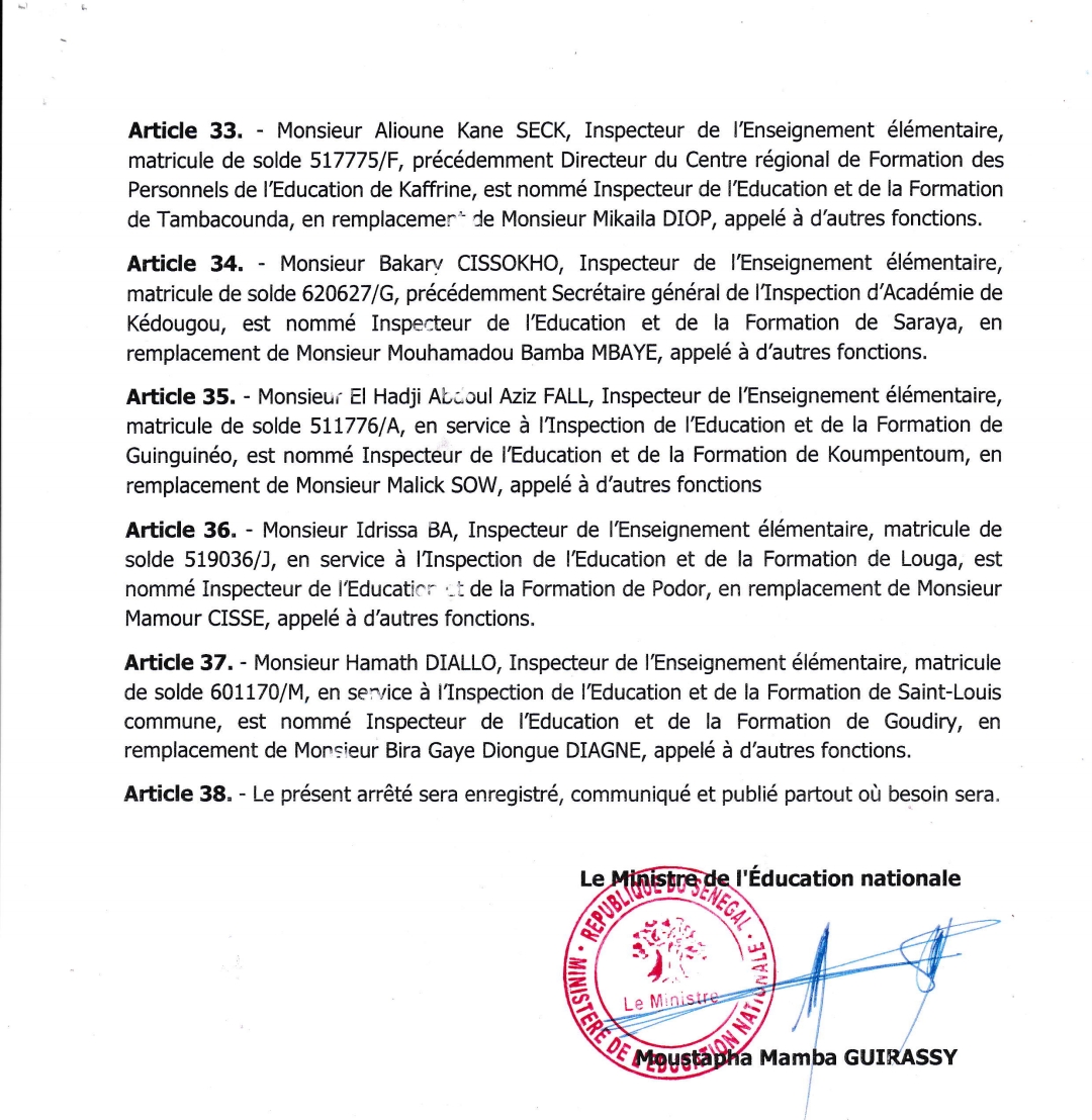 Le ministre de l'Education Nationale a procédé à un vaste chamboulement dans les rangs des Inspecteurs de l’Education et de la Formation du Sénégal. Selon les informations de kedougou7tv.com, Moustapha Mamba Guirassy a changé les chefs de service de plusieurs entités. Ces choix ont été faits à l’issue d’un appel à candidatures où les intéressés ont soumis des projets d’éducation.